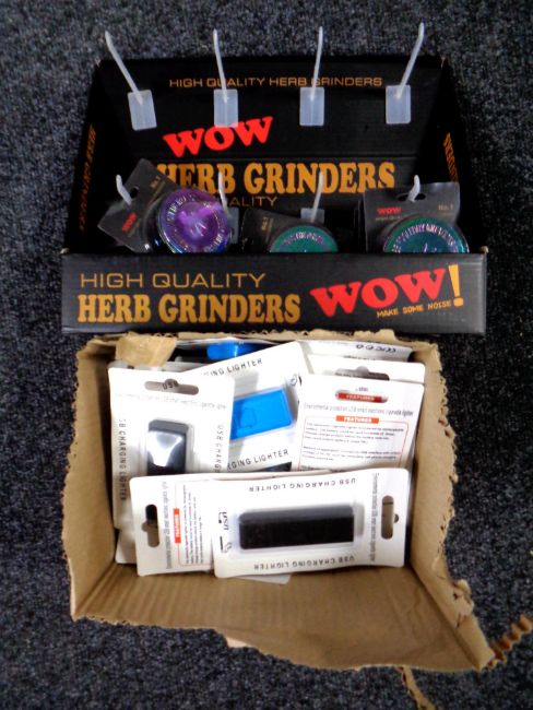 Five boxes of new stock including lighters, cigarette filters, herb grinders etc