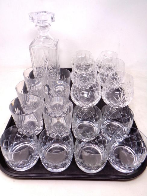 A tray of cut glass decanter, rummers, whisky tumblers etc