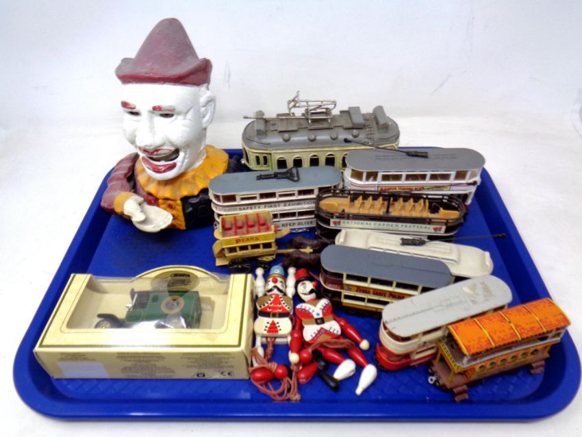 A tray of die cast trams, Corgi, reproduction Jester money box, die cast car etc