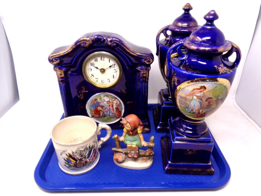 A tray of transfer printed three piece clock garniture set, Devon fieldings mug, Goebel figure