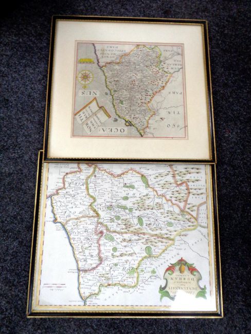 A hand coloured engraved map after Robert Morden -The Bishoprick of Durham together with a further map of Northumberland after Saxton and two gilt framed crystoleums (latter two as found)