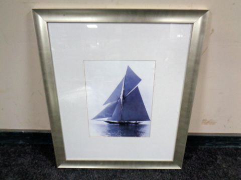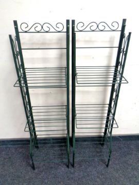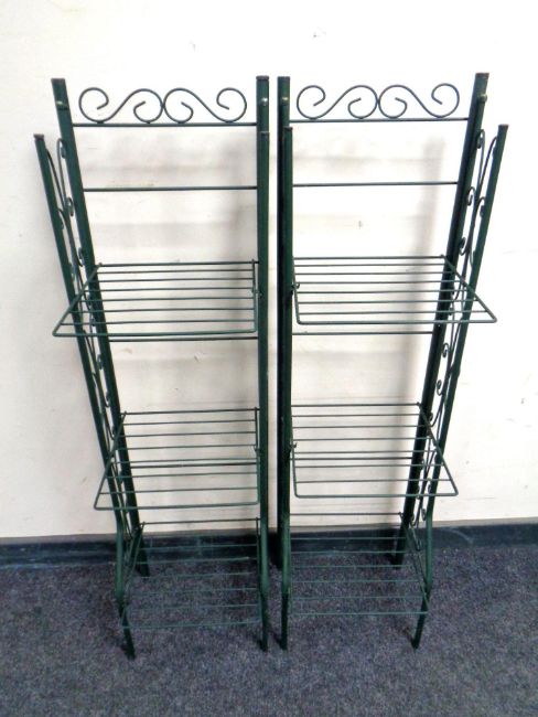 A pair of folding metal green house plant stands and a print of a sailing boat