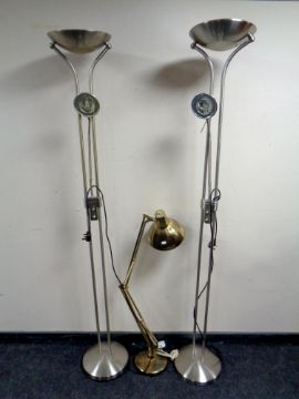 A pair of up lighters and a brass angle poised lamp