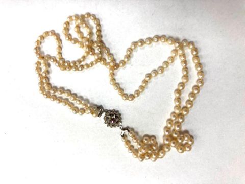 A double strap of pearls on white gold clasp set with a ruby
