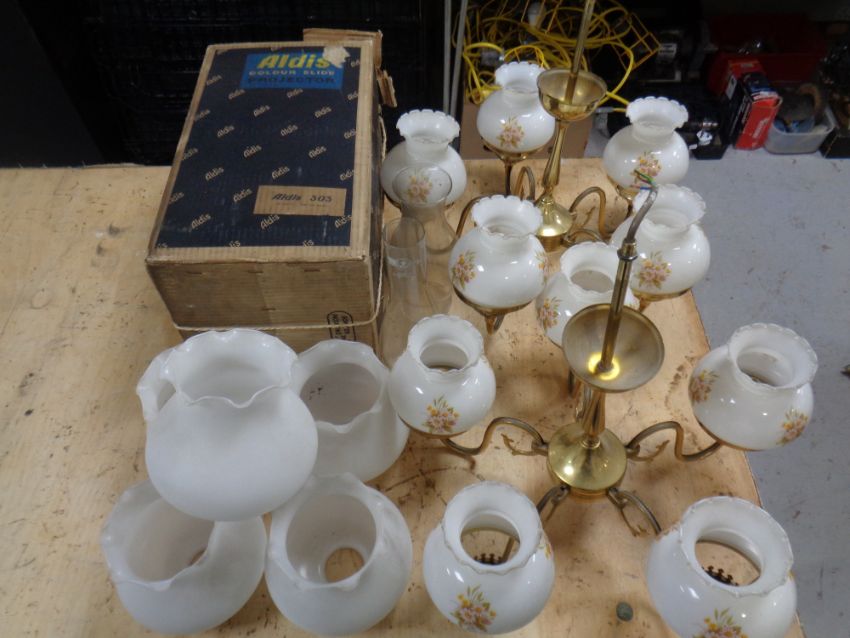 Two brass light fittings with glass shades, five further opaque glass shades, two oil lamp chimneys and a boxed Aldis projector
