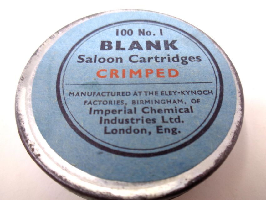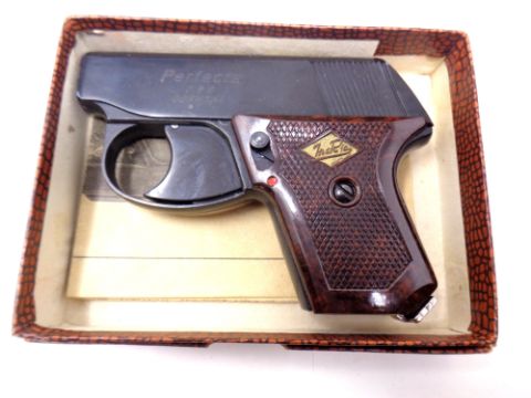 A German Perfecta starting pistol with tin of caps