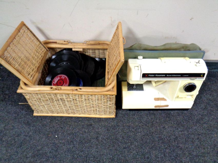 A Frister Rossmann electronic sewing machine, no foot pedal, wicker hamper containing vinyl records