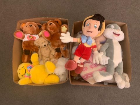 Two boxes containing twenty seven soft toys - Teddy bears, Pinocchio, Bugs Bunny, etc, etc. (27)