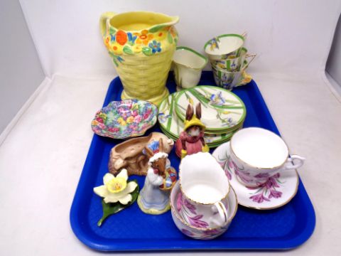 A tray of basket weave pottery jug, Doulton part tea set, Bunnykins figures etc