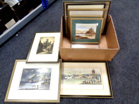 A box of antique and later pictures, hand coloured engraving Northumberland races 1826, further pictures of Bamburgh, hand coloured map after Ogilvy, The continuation of the road from London to Barwick etc