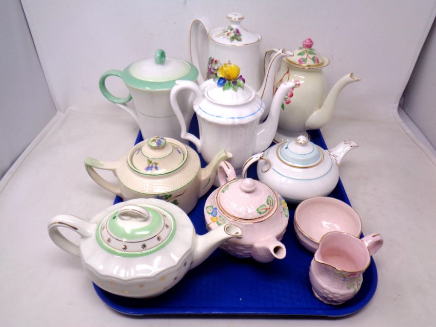 A tray of Crown Devon tea pot, milk jug and sugar bowl, seven further tea pots