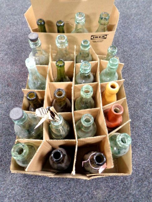 A collection of antique stoneware and glass bottles, ginger beer bottles, bottles marked Rirchardson and Co Byker bank Newcastle on tyne