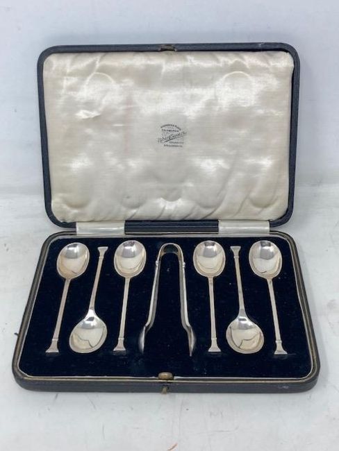 A set of six silver tea spoons with matching sugar tongs, Sheffield 1930, 91.3g, cased.