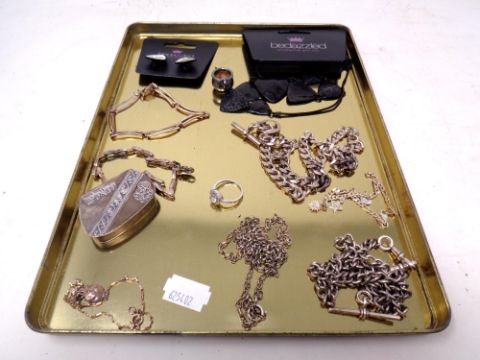 A tray of silver jewellery, Albert chain with t-bar, dress ring, chain necklace etc