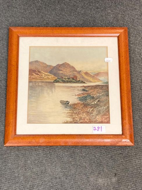 Twentieth century school : Castle by a loch, watercolour, indistinctly signed, 25 cm x 25 cm, framed.