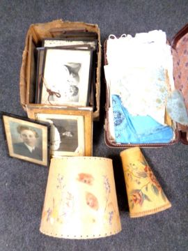 A vintage case containing 20th century linen, lamp shades, box of pictures and prints