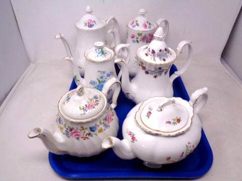 A tray of six porcelain tea pots including Sadler, Royal Albert, Queen Ann