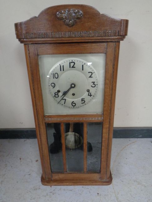 An oak eight day wall clock with silvered dial