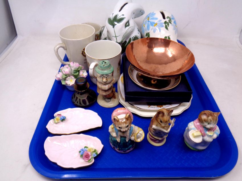 A tray of Beatrix Potter figures, pottery money boxes, Isle of Wight glass scent bottle, commemorative mugs