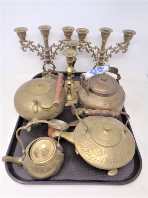 A tray of antique and later brass ware including teapots, pair of candlesticks, candelabrum etc