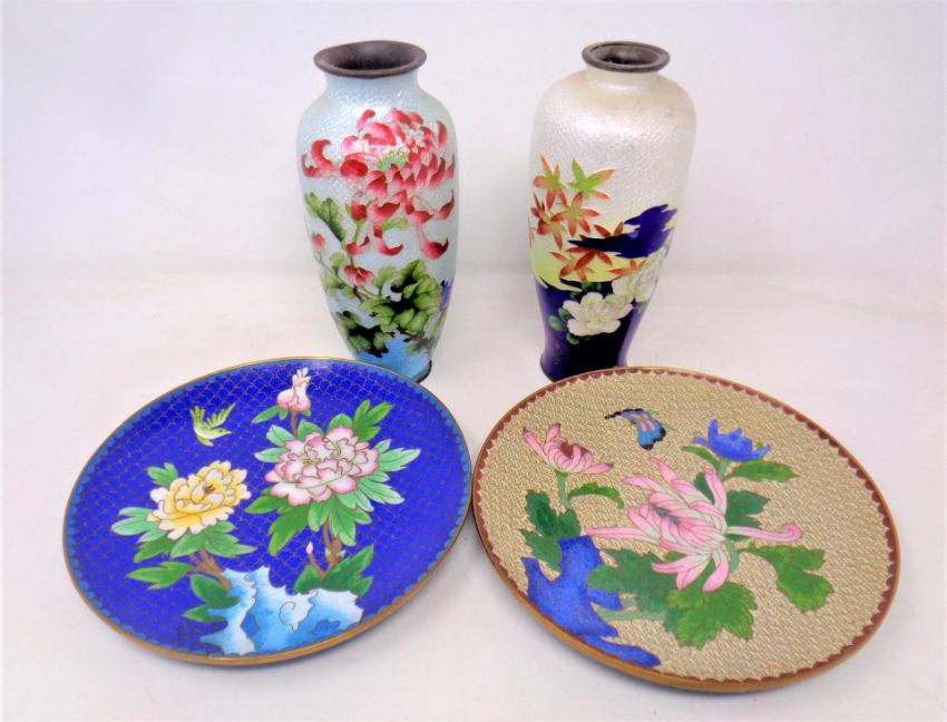 Two Japanese ginbari cloisonne baluster vases (both as found) and two cloisonne dishes