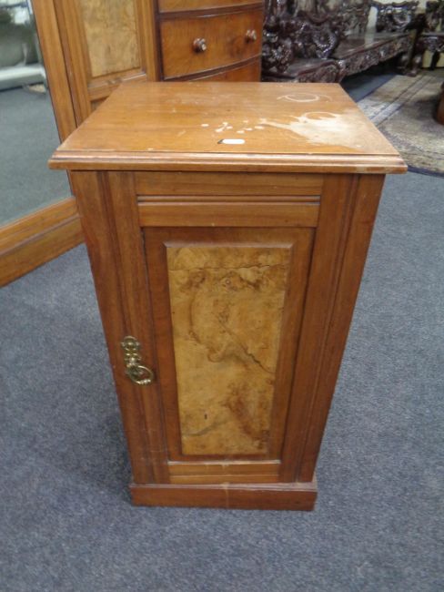 A 19th century mahogany and walnut three piece bedroom suite comprising of triple door wardrobe, four-drawer dressing chest and bedside cupboard