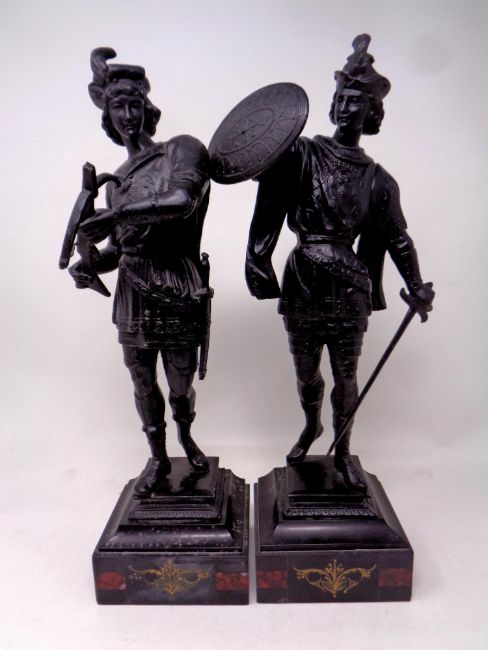 A pair of painted spelter figures on black marble bases