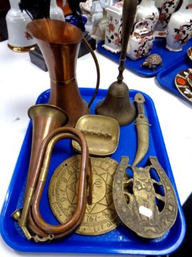 A tray of assorted brass and copper wares - hunting horn, jug, hand bell, Persian dagger in sheath, trivet etc