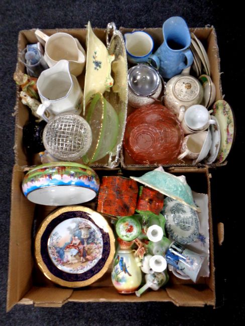 Three boxes of ceramics and glass ware : pink glass dessert set, teapots, jugs, cottage ware, dressing table set etc
