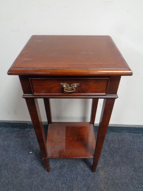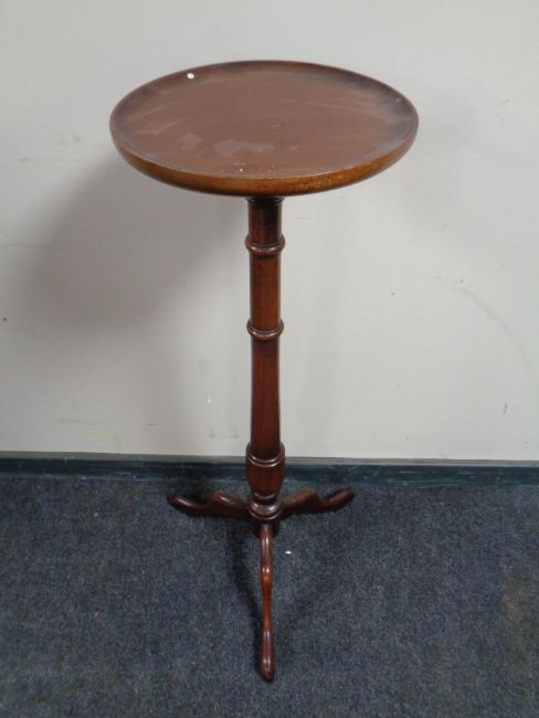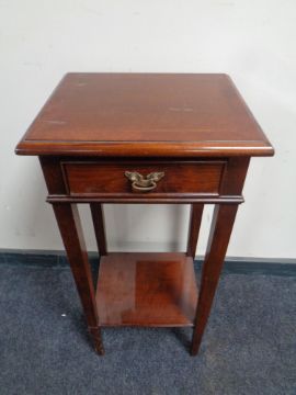 A mahogany torchere together with a two-tier telephone table fitted a drawer