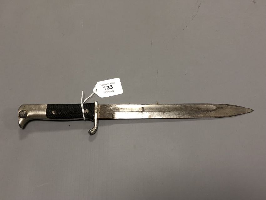 A Second World War German K98 parade bayonet with nickel plated hilt, lacks scabbard