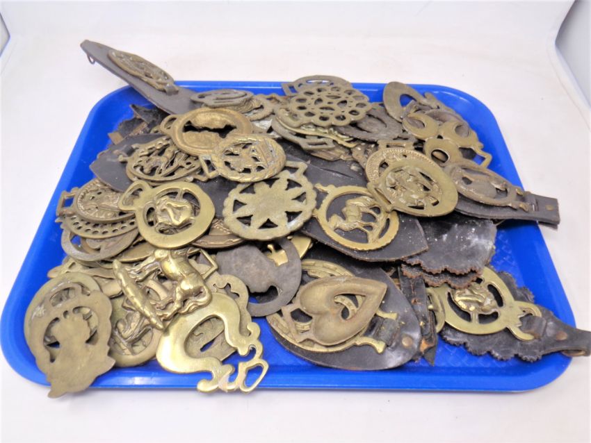 A tray of horse brasses, some on leather straps