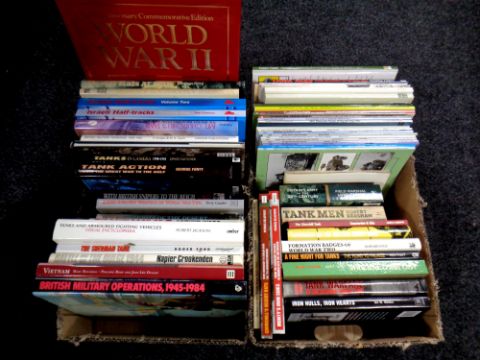 Two boxes of books relating to military vehicles and warfare