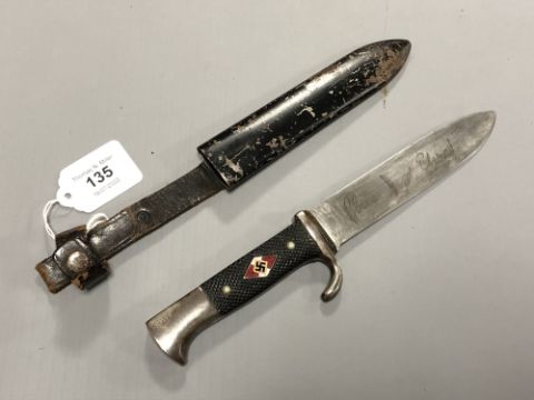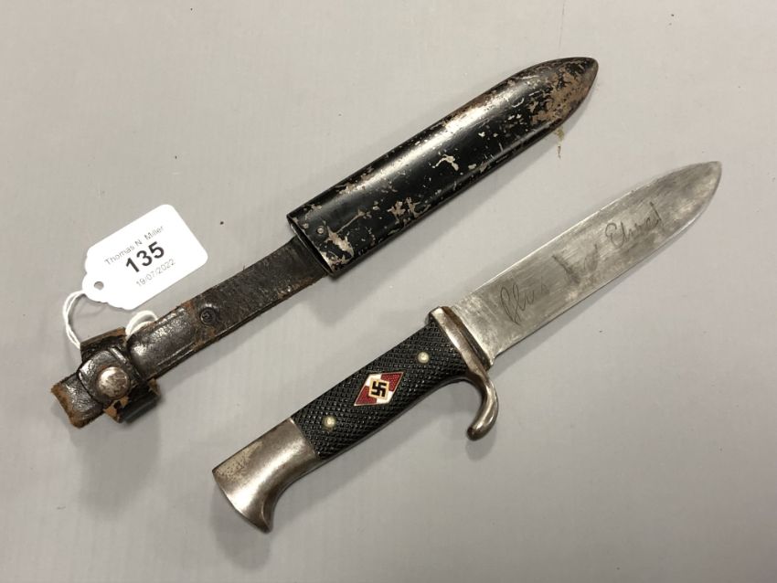 A German 1933-1938 Hitler Youth knife by C Gustav Spitzer, Solingen, in metal scabbard. The blade etched 'Blut und Ehre!' or 'Blood and Honour!'; this motto was discontinued by the organisation in August 1938.