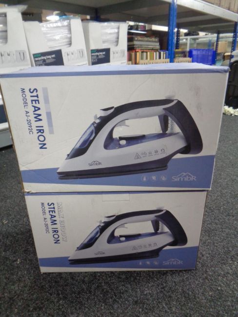 Two boxed Simbr steam irons