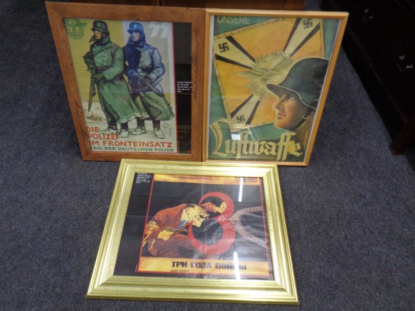 Three framed WWII style propaganda posters
