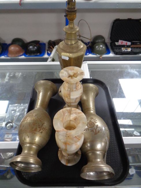 Pair of onyx vases, height 19.5 cm, pair of vases and Eastern brass table lamp