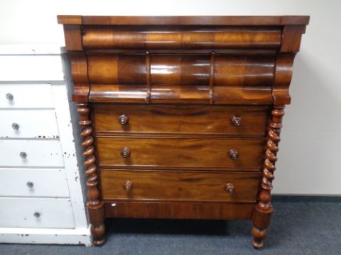 A Victorian mahogany seven drawer Scotch chest with barley twist column supports