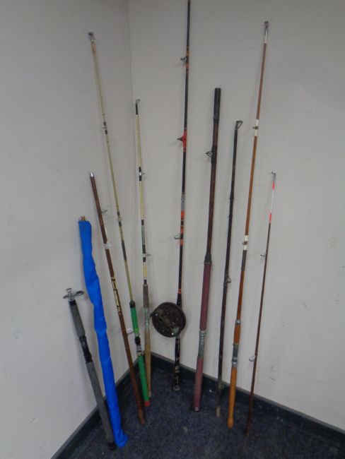 A bundle of assorted fishing rods and a Scarborough fishing reel