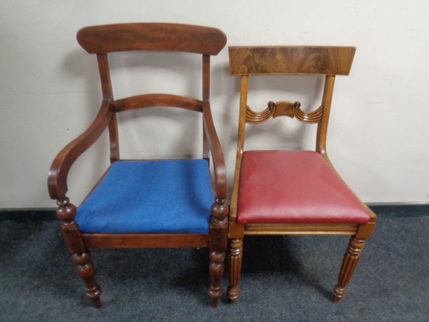 A Victorian mahogany armchair and similar dining chair