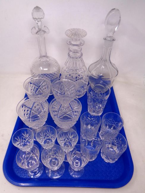 A tray of three cut glass decanters with stoppers, set of four wine glasses, tumblers etc