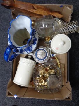 Box of ceramics and glass ware : Booths Real Old Willow teapot, kitchen storage jars, blue and white jug, over sized wine goblets, candlesticks etc