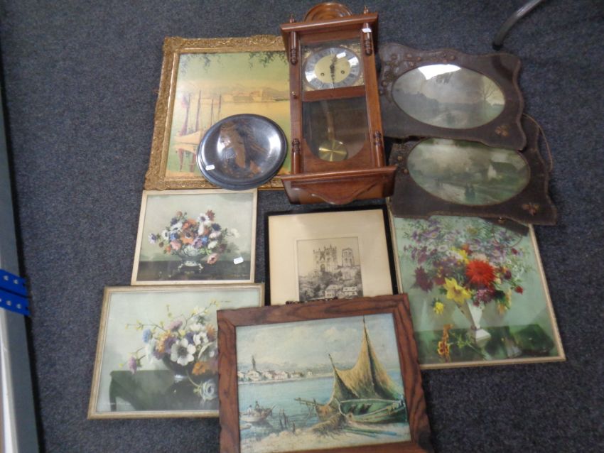 An eight day wall clock and a quantity of wall plaques, pictures and prints