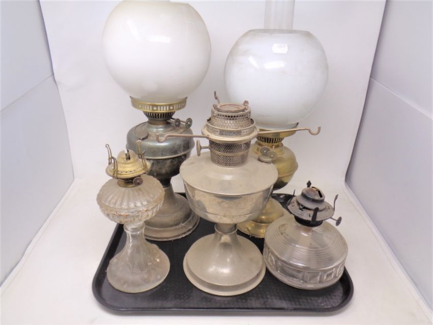 A tray of five assorted oil lamps to with chimneys and shades