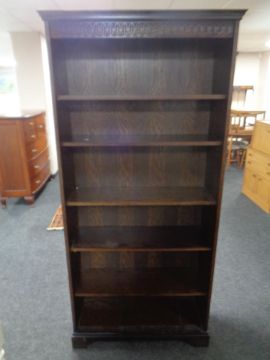 A set of open bookshelves in an oak finish