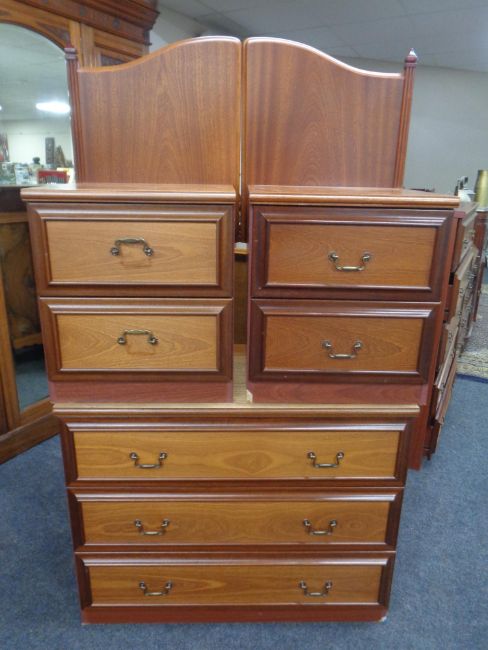 A 20th century five-drawer chest with matching three-drawer chest and pair of two-drawer bedside stands in a mahogany finish