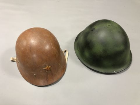 A 20th century Asian military helmet together with a Soviet example