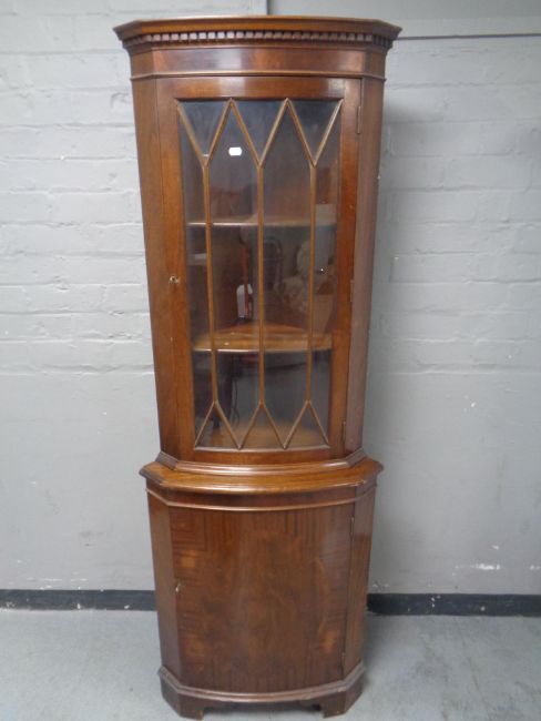 A glazed door corner cabinet fitted a cupboard below