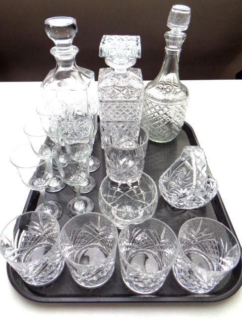 A tray of three cut glass decanters, set of four whisky tumblers, six wine glasses etc