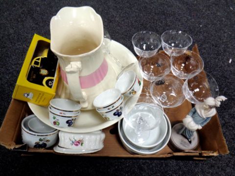 A box of 19th century wash jug and basin, assorted glassware, ramekins, oven dishes, Ringtons money box etc